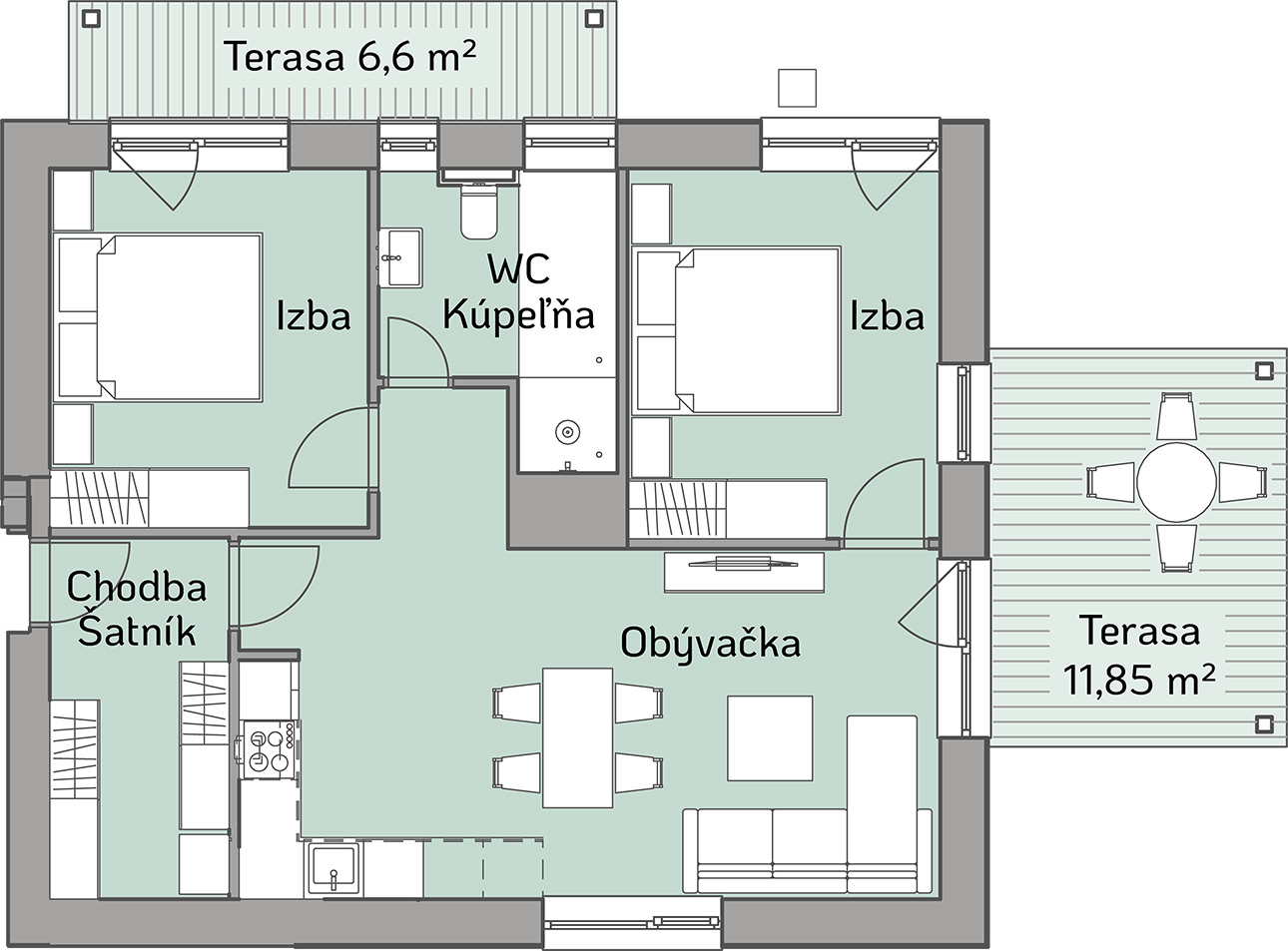 krásnej tatranskej prírody. Až 2 terasy, obe veľmi príjemné – tá väčšia takmer 12 m² je na južnej strane. Tie